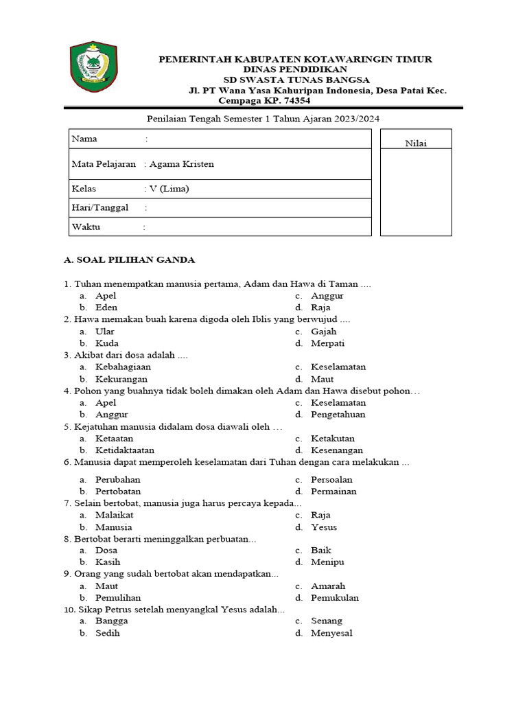 Pendidikan agama Kristen di jenjang Sekolah Dasar (SD) memegang peranan krusial dalam membentuk karakter dan pemahaman spiritual anak sejak dini. Kelas 3 SD menjadi titik penting di mana anak-anak mulai menginternalisasi ajaran-ajaran dasar iman Kristen, memahami tokoh-tokoh Alkitab, serta mengaplikasikan nilai-nilai kasih dan pengampunan dalam kehidupan sehari-hari. Untuk mengukur sejauh mana pemahaman ini tercapai, evaluasi melalui soal ujian menjadi sebuah keniscayaan.